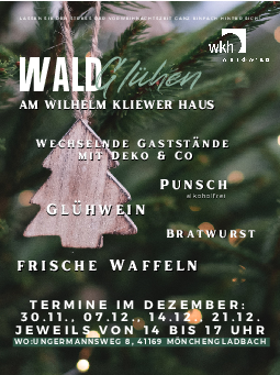 Im Wilhelm Kliewer Haus im idyllischen Hardter Wald wird Ihre Weihnachtsfeier zu einem ganz besonderen Erlebnis – ob für Firmen, Vereine oder privat. Starten Sie zum Beispiel mit einem heißen Glühwein-Aperitif an unseren stimmungsvollen Weihnachtsbuden und feiern Sie anschließend in einem unserer festlich geschmückten Räume: